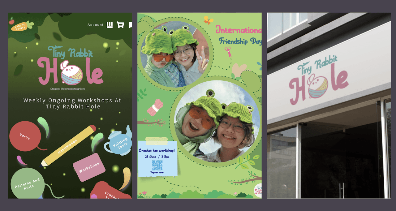 A mobile website prototype for Tiny Rabbit Hole, a Singapore-based crochet brand, evokes a sense of childlike wonder while showcasing products and workshops. Creating the logo, poster, and app design, resulting in a cohesive brand and UX refined over a 3-month iterative process.